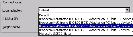 - In the discover portal tab, click Discover Portal --> Enter your SAN IP and port # --> click Advanced --> In the local adapter drop down select your ISCSI adapter (Broadcom) --> in the initator IP make sure you select the IP you assigned in step 2.