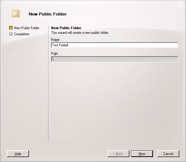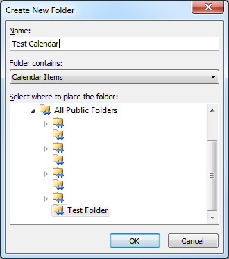 Now head on over to Outlook. Expand Public Folders and your new Test Folder should be there. Right click on the folder and select New Folder. Change the drop down to Calendar Items and give it a name. Click Ok when you're done.