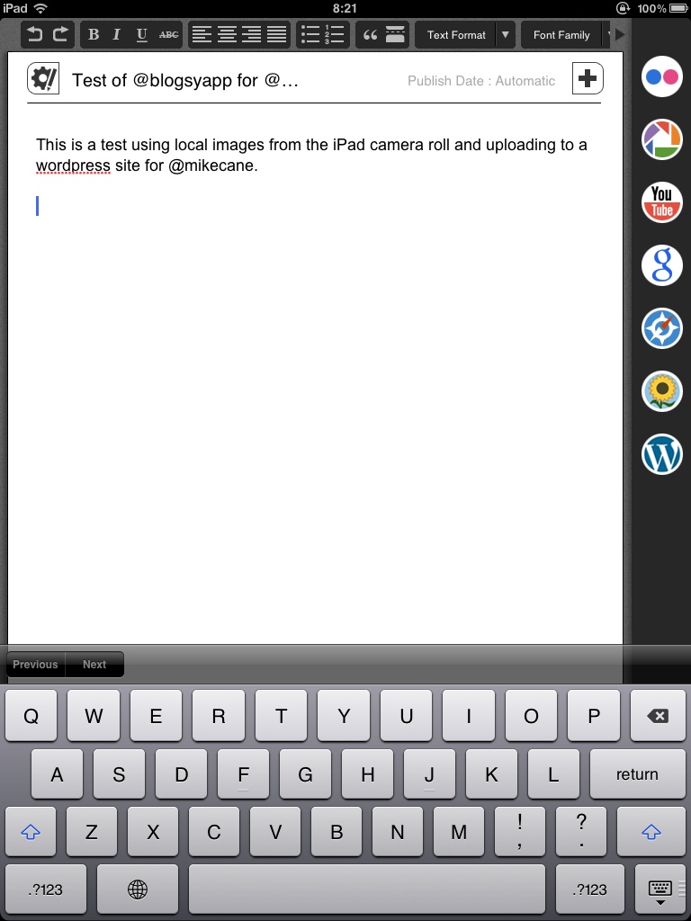 Test of @blogsyapp for @mikecane This is a test using local images from the iPad camera roll and uploading to a wordpress site for @mikecane.